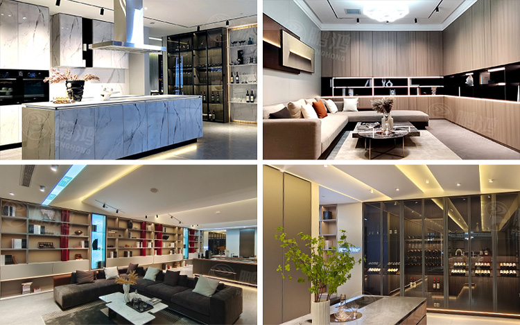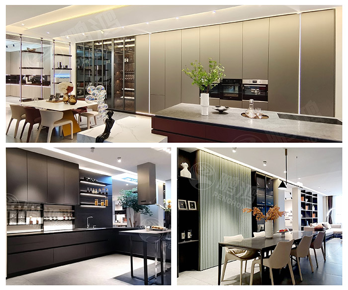 展廳分為落地區、高定區兩大核心區域,技術工藝同步升級。3米挑高門板、準分子飾面、超承重層板、三明治板、懸浮式隔斷柜……特色之處不勝枚舉,而這源于鵬鴻家居團隊的探索與革新,更源于鵬鴻人對美好生活的極致追求。