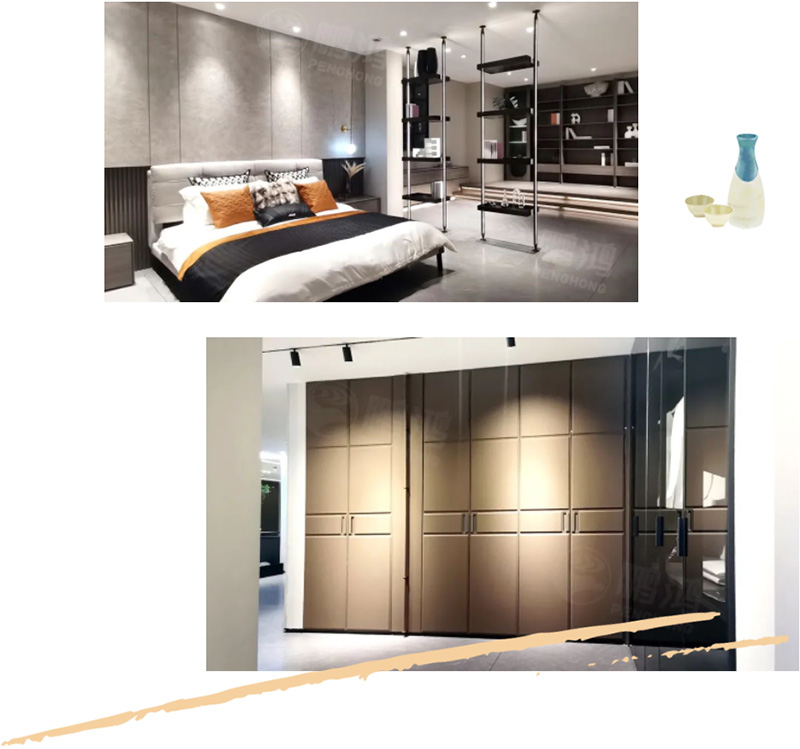 與傳統工業化加工不同,鵬鴻家居展廳傾注了更多的人文關愛。45°拼接工藝、海棠角收邊護角、門墻柜一體化輸出、PET造型門板、內嵌式隱藏卡件……家居不再是冰冷的組裝件,而是從視覺、聽覺、觸覺等多重角度,全方位呵護生活的“家庭成員”。